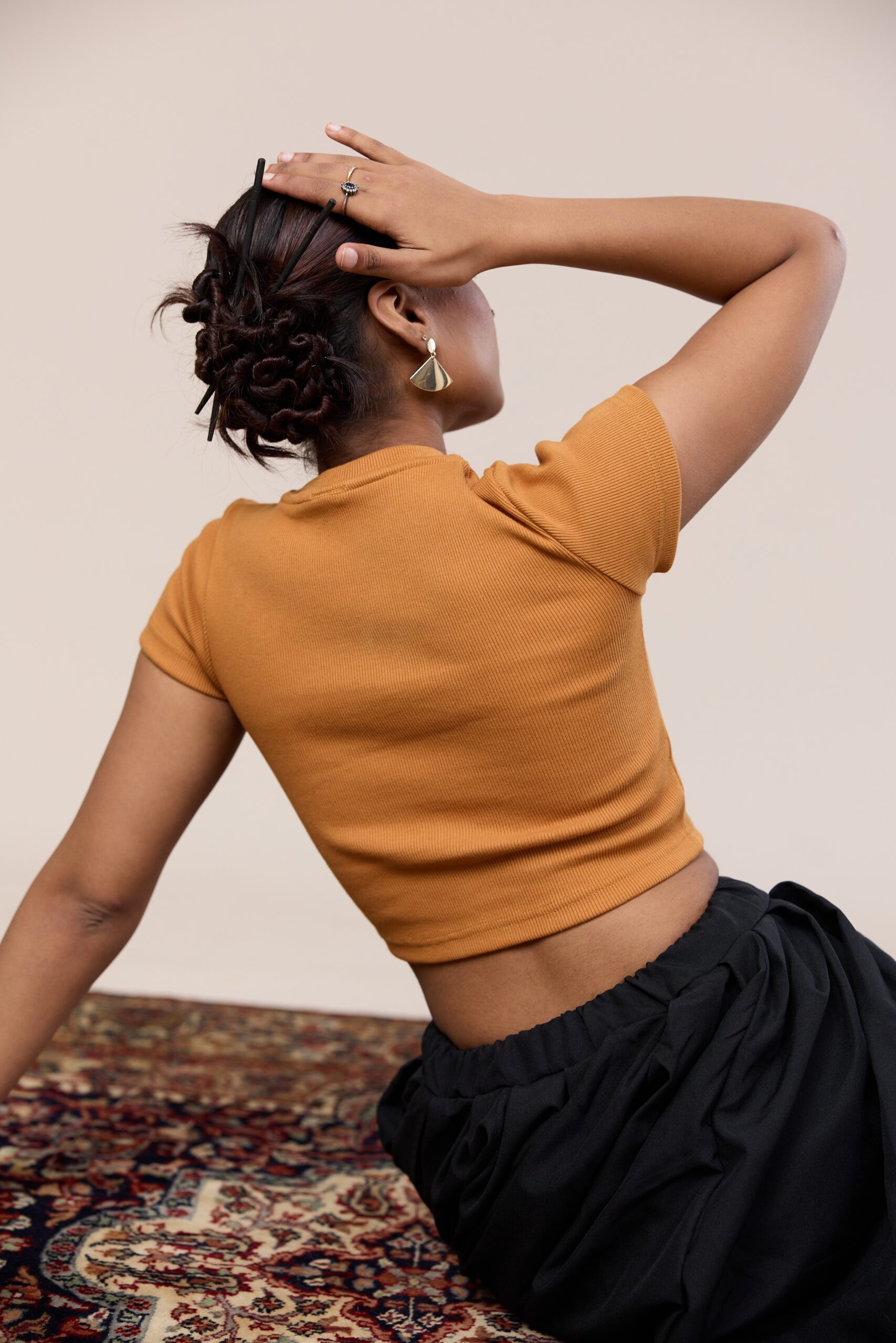 Crew Neck Crop top in rib fabric with piping detail. Cotton Spandex mix.